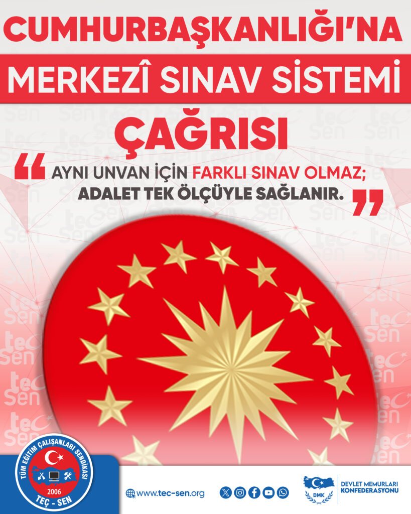 Tüm Eğitim Çalışanları Sendikası (TEÇ-SEN) olarak, kamu kurumlarında gerçekleştirilen Görevde Yükselme (GYS) ve Unvan Değişikliği (UDS) sınavlarının merkezî bir sistem altında yapılması için Cumhurbaşkanlığı’na resmî başvuruda bulunduk.