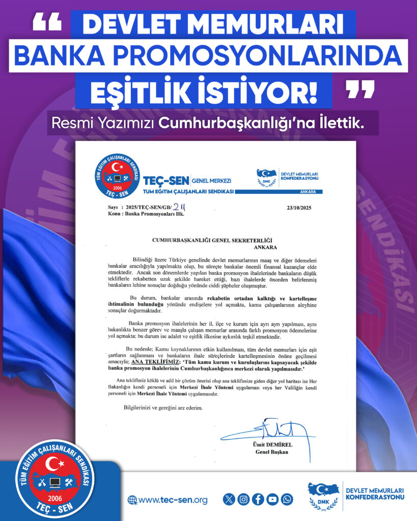Devlet Memurları Konfederasyonu ve TEÇ-SEN olarak; promosyon ihalelerinin Cumhurbaşkanlığı tarafından merkezi olarak yürütülmesini ve tüm kurumlarda eşit şartların sağlanmasını talep ediyoruz.