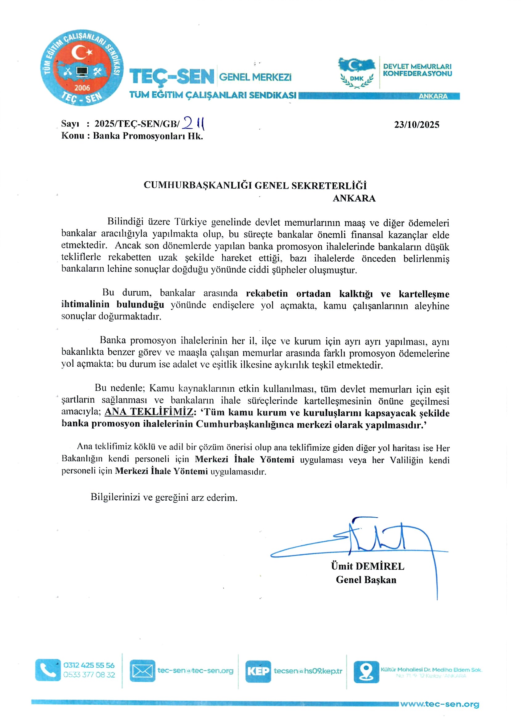 Devlet Memurları Konfederasyonu ve TEÇ-SEN olarak; promosyon ihalelerinin Cumhurbaşkanlığı tarafından merkezi olarak yürütülmesini ve tüm kurumlarda eşit şartların sağlanmasını talep ediyoruz.