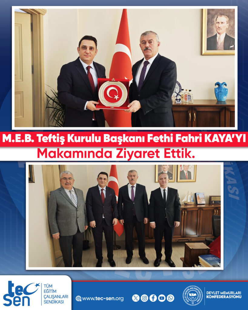 Genel Başkanımız Ümit DEMİREL, Genel Başkan Vekilimiz S. Burçin POYRAZ ve Genel Başkan Yardımcımız Ramazan TÜRKASLAN’dan oluşan heyetimiz, Millî Eğitim Bakanlığı Teftiş Kurulu Başkanı Sayın Fethi Fahri KAYA’yı makamında ziyaret etti.